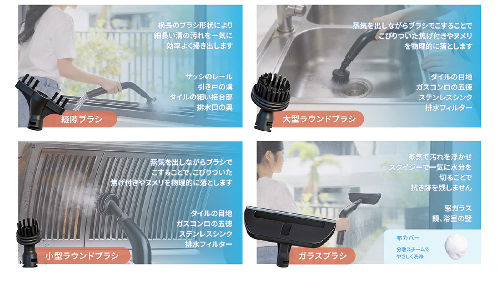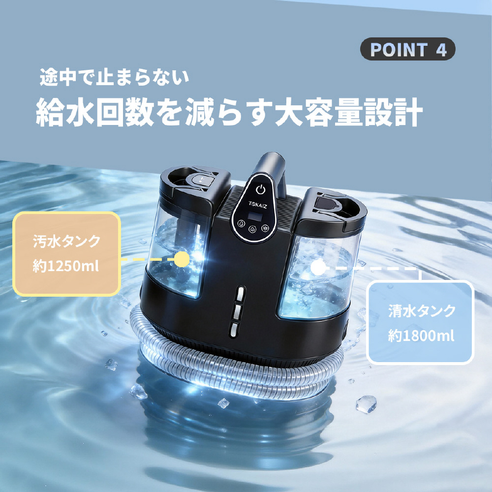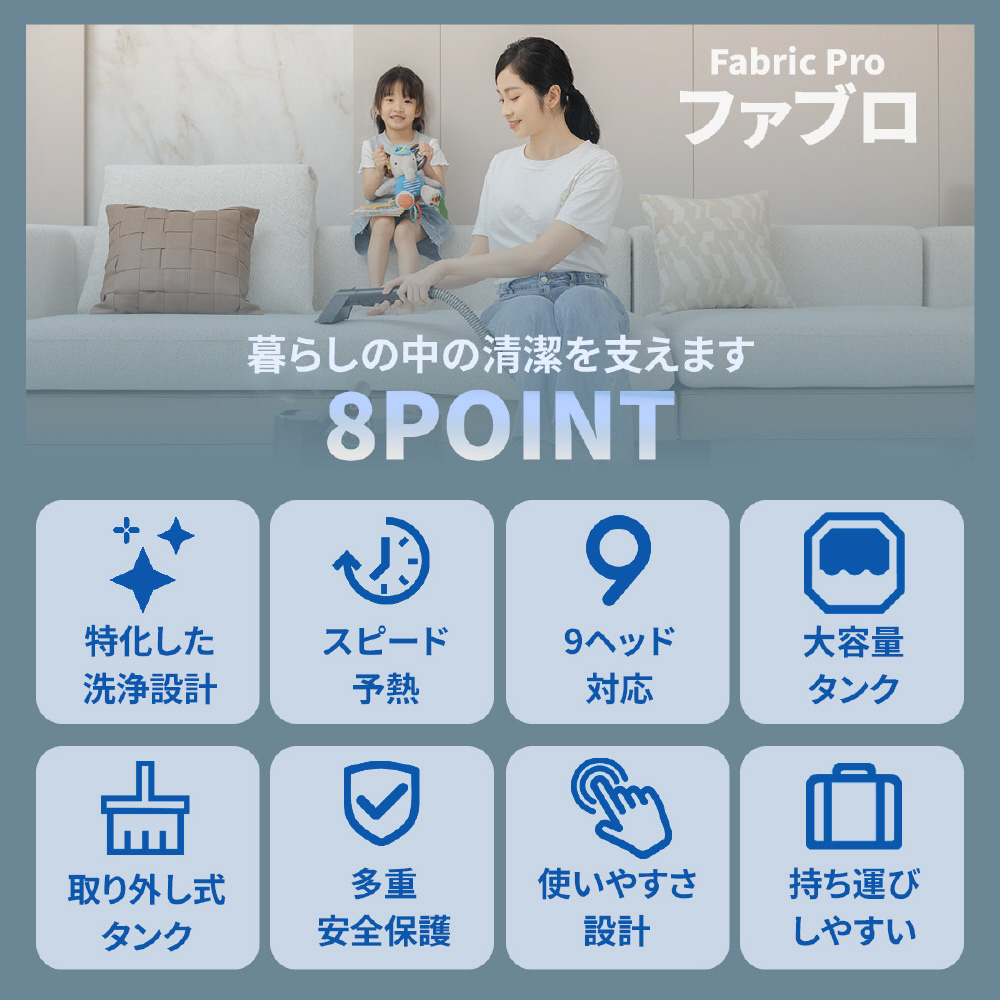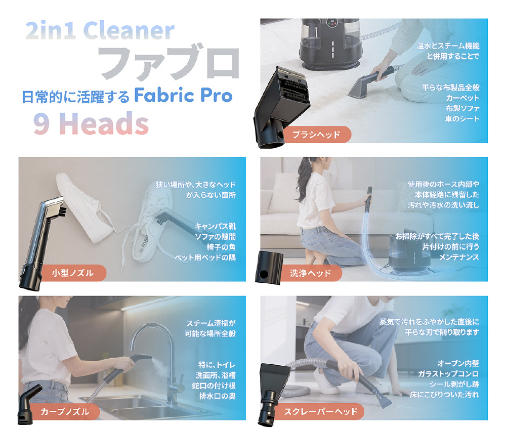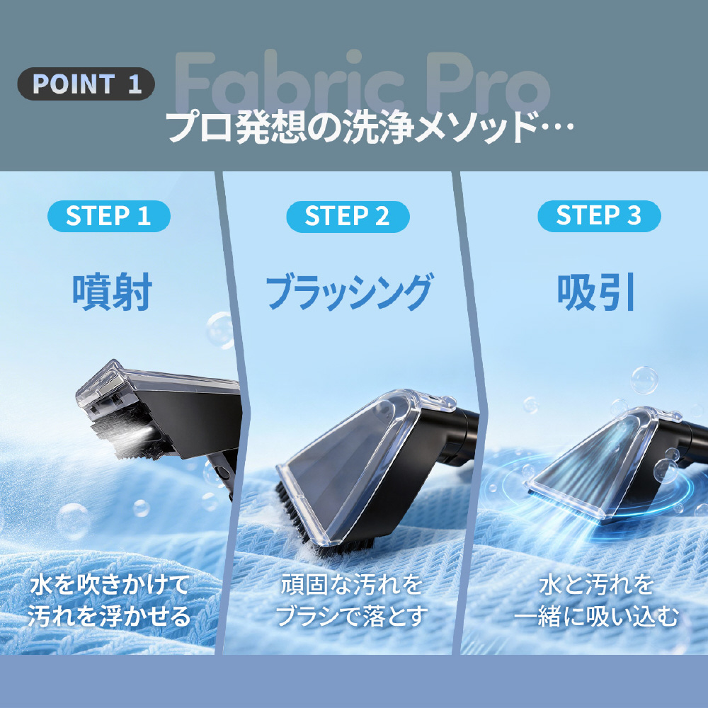 100℃スチームで汚れを浮かせ、最大18,000Paの強力吸引でしっかり回収。温度4段階×吸引力3段階調整、日本語音声ガイド搭載で、布製品を手軽に清潔ケア。洗浄も吸引も、これ一台。