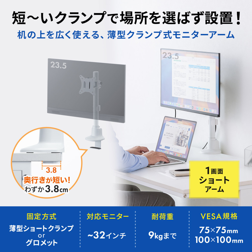 | 商品名 | モニターアーム [1画面 /〜32インチ] ショートアーム・薄型ショートクランプ ホワイト CR-LAC115W |