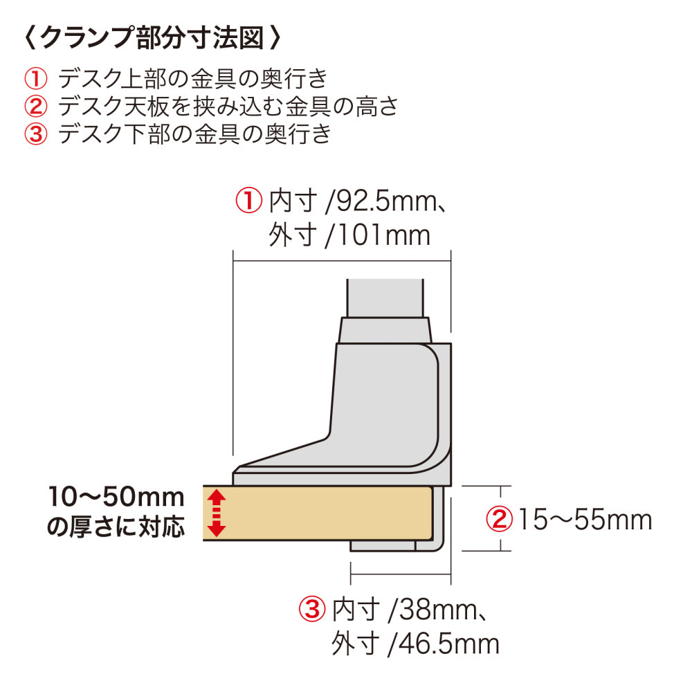 ■取り付けできる天板厚はクランプの場合が10〜50mm、グロメットの場合が10〜55mmです。