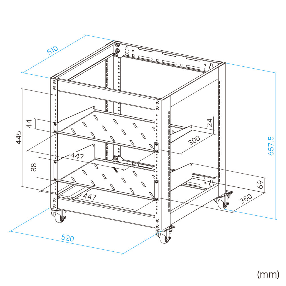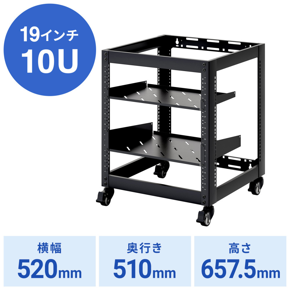 ネットワークラックキャビネット 10U [W520xD510xH657.5mm] 19インチマウントラック 耐荷重50kg キャスター/壁面設置対応 EIA規格 音響/検査機器対応 CP-NWR10UBK