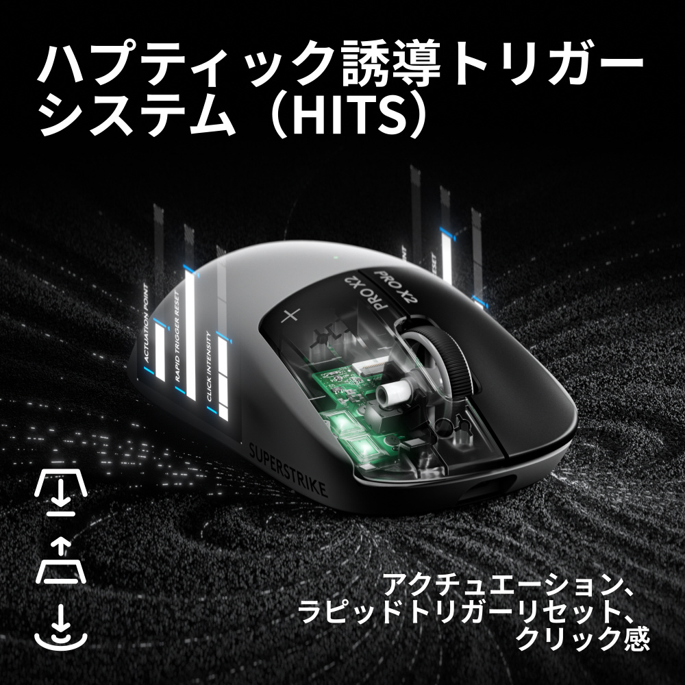 本製品は、世界のeスポーツ選手との共同開発で生まれた、世界初*のハプティック誘導トリガーシステム(HITS)をクリックボタンに搭載しています。「PRO X2 SUPERSTRIKE」は、左右のマウスクリックの部分に押下量を連続的かつ即座に検知する誘導システムを採用することで、クリック入力が従来より最大30ミリ秒高速化しました。これにより、勝敗を分ける一瞬の操作に高いレスポンスをもたらします。
