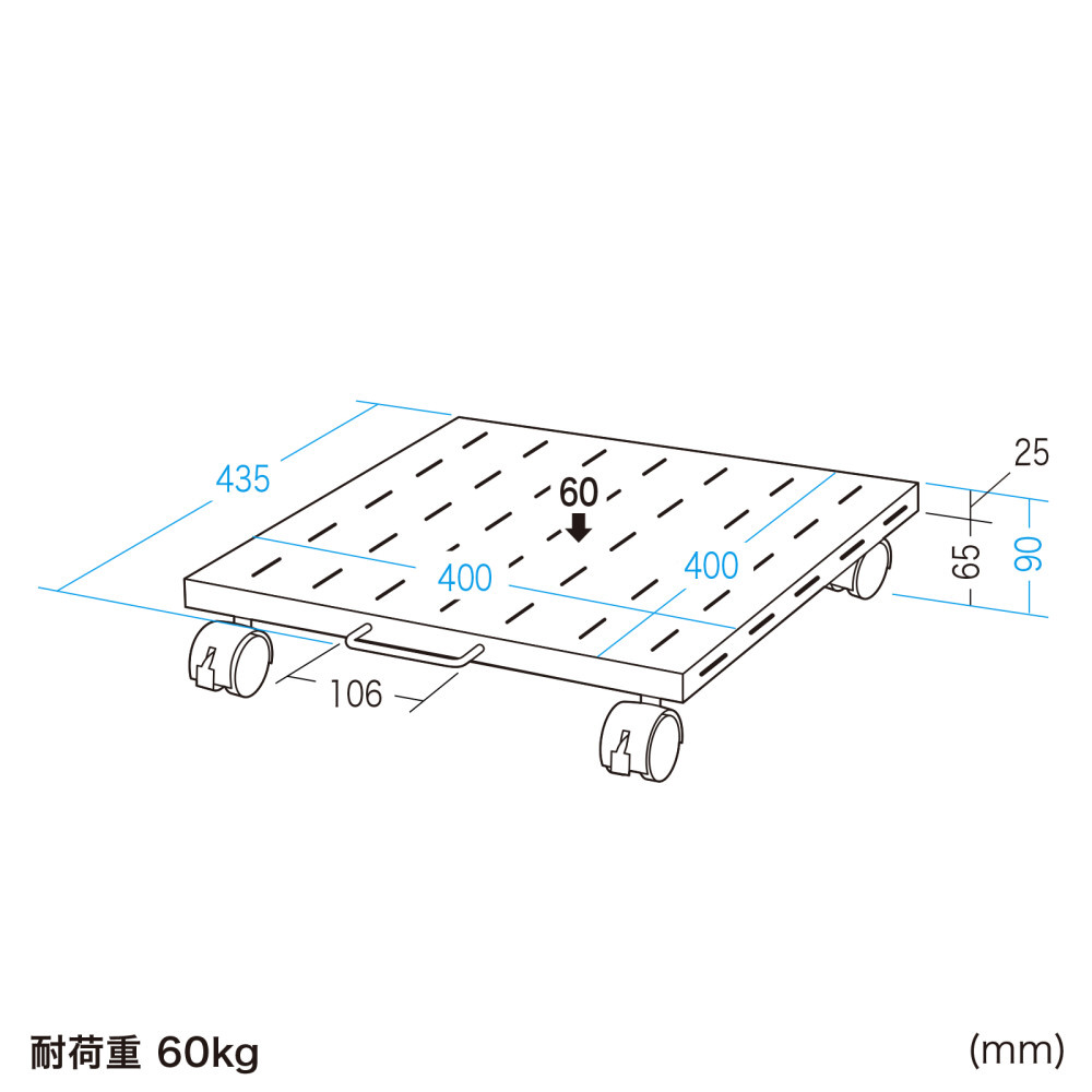 | 仕様1 | [天板サイズ] W400×D400×t1mm [総耐荷重]60kg [サイズ]W400×D435×H90mm [重量]2.96kg [材質]天板/スチール(エポキシ樹脂粉体塗装)、キャスター/ナイロン [キャスターの有無]あり [キャスター径]50mm [出荷形態]ノックダウン組立式(お客様組立て) |