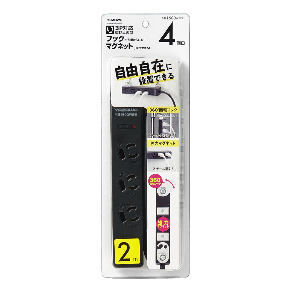 3P抜け止めマグネットフック付タップ4個口2m 黒 H5HJKNP402BK 360°回転フック・強力マグネット・雷ガード機能付き 3Pプラグ対応 [2.0m /4個口 /スイッチ無]