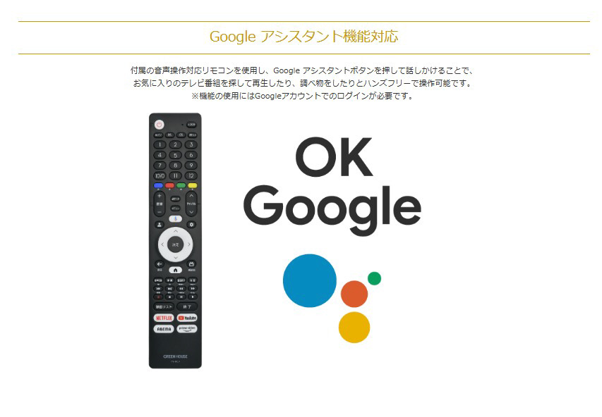 付属の音声操作対応リモコンを使用し、Google アシスタントボタンを押して話しかけることで、お気に入りのテレビ番組を探して再生したり、調べ物をしたりとハンズフリーで操作可能です。