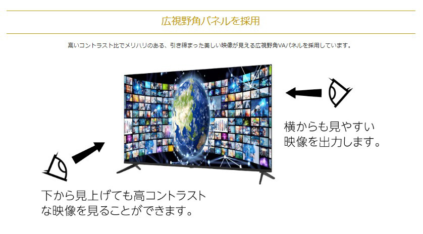 高いコントラスト比でメリハリのある、引き締まった美しい映像が見える広視野角VAパネルを採用しています。