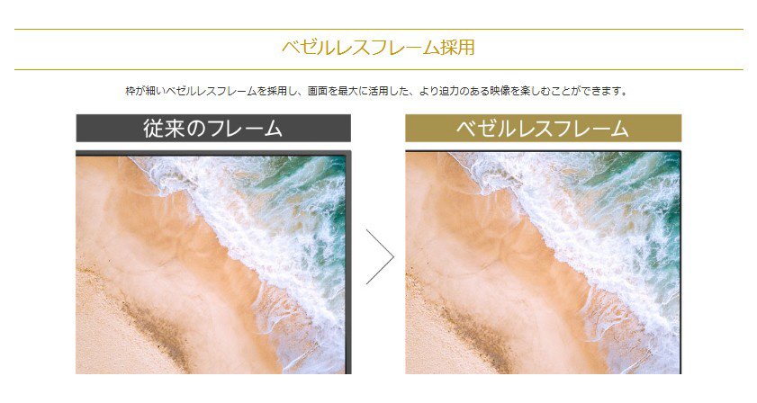 枠が細いベゼルレスフレームを採用し、画面を最大に活用した、より迫力のある映像を楽しむことができます。