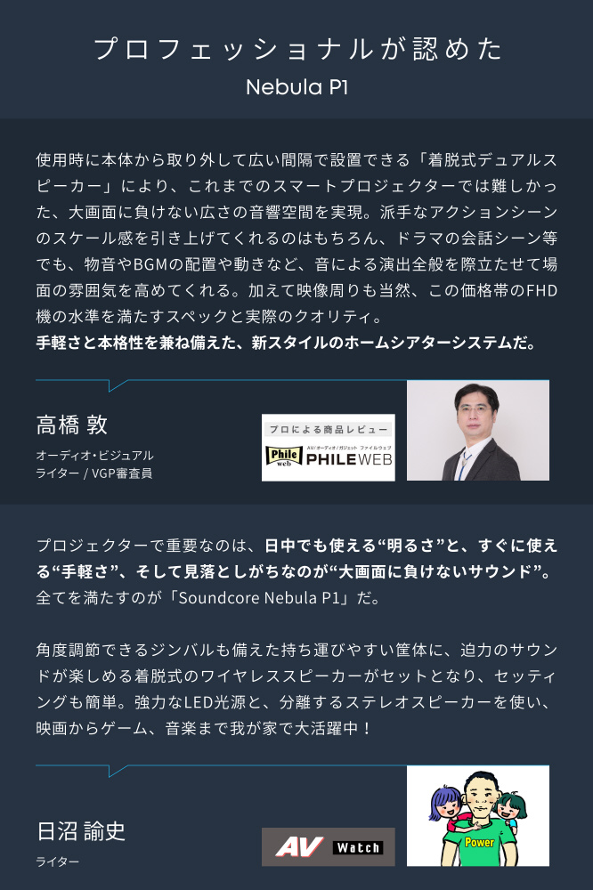 | 仕様1 | 世界初着脱式デュアルスピーカー搭載プロジェクター |