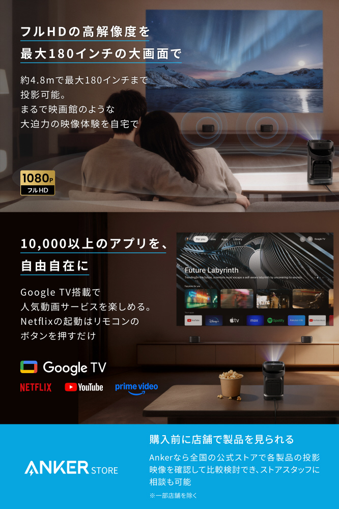 独自技術の「IEA 4.0」搭載で、斜めからでも簡単に投影可能。オートフォーカスで常にくっきりとした映像美を。約4.8mで最大180インチまで投影可能で、大迫力な映像体験を自宅で