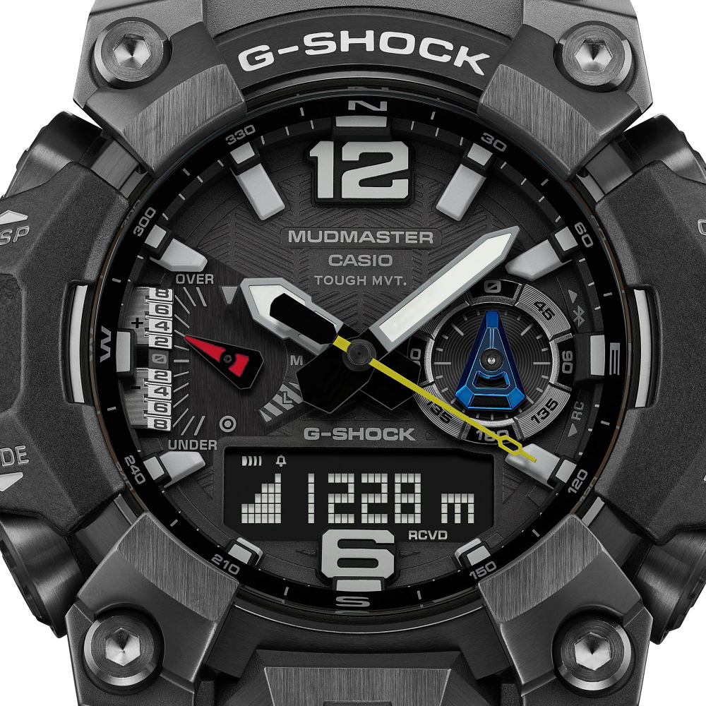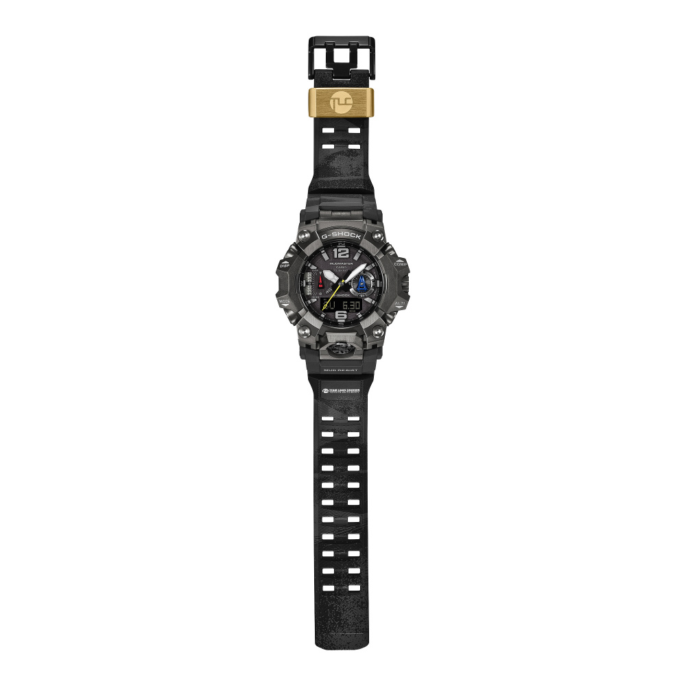 ベースモデルは、カーボンコアガード構造のケースで、高強度かつ耐久性に優れたカーボン繊維強化樹脂ケースと高精度の鍛造技術によるメタル素材を融合したMASTER OF G(マスターオブG)MUDMASTER GWG-B1000。