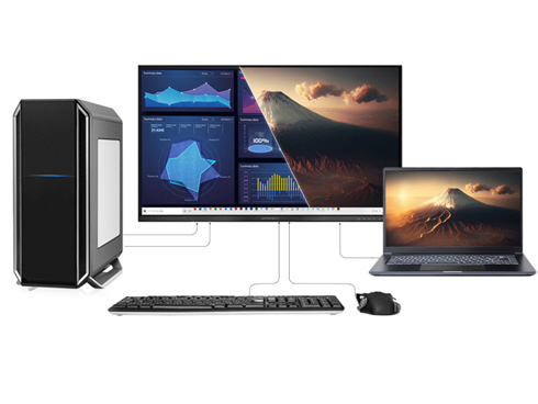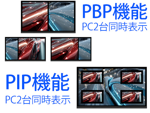 ■複数の入力映像を同時に表示するPIP(Picture In Picture)とPBP(Picture By Picture)に対応、PIPではもう一つの入力画面を子画面(左上/右上/左下/右下から選択)で同時表示が可能。PBPでは2つの入力を左右に同時表示することが可能です。また、KVM機能に対応し、モニターに接続したキーボード、マウスをデスクトップPCやUSB Type-C接続のノートPCで入力を切り替えた際にもそのまま使用可能です。