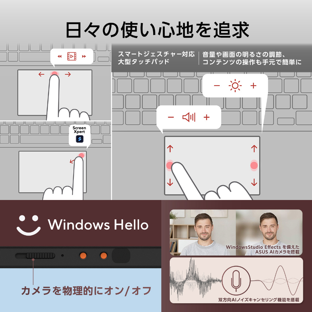 スマートジェスチャー対応の大型タッチパッドにより、音量や明度の調節、コンテンツの操作も手元で簡単に行えます。また、Windows Helloと物理的なウェブカメラプライバシーシールドを備えた赤外線IRカメラで、高いセキュリティを簡単に使用いただけます。