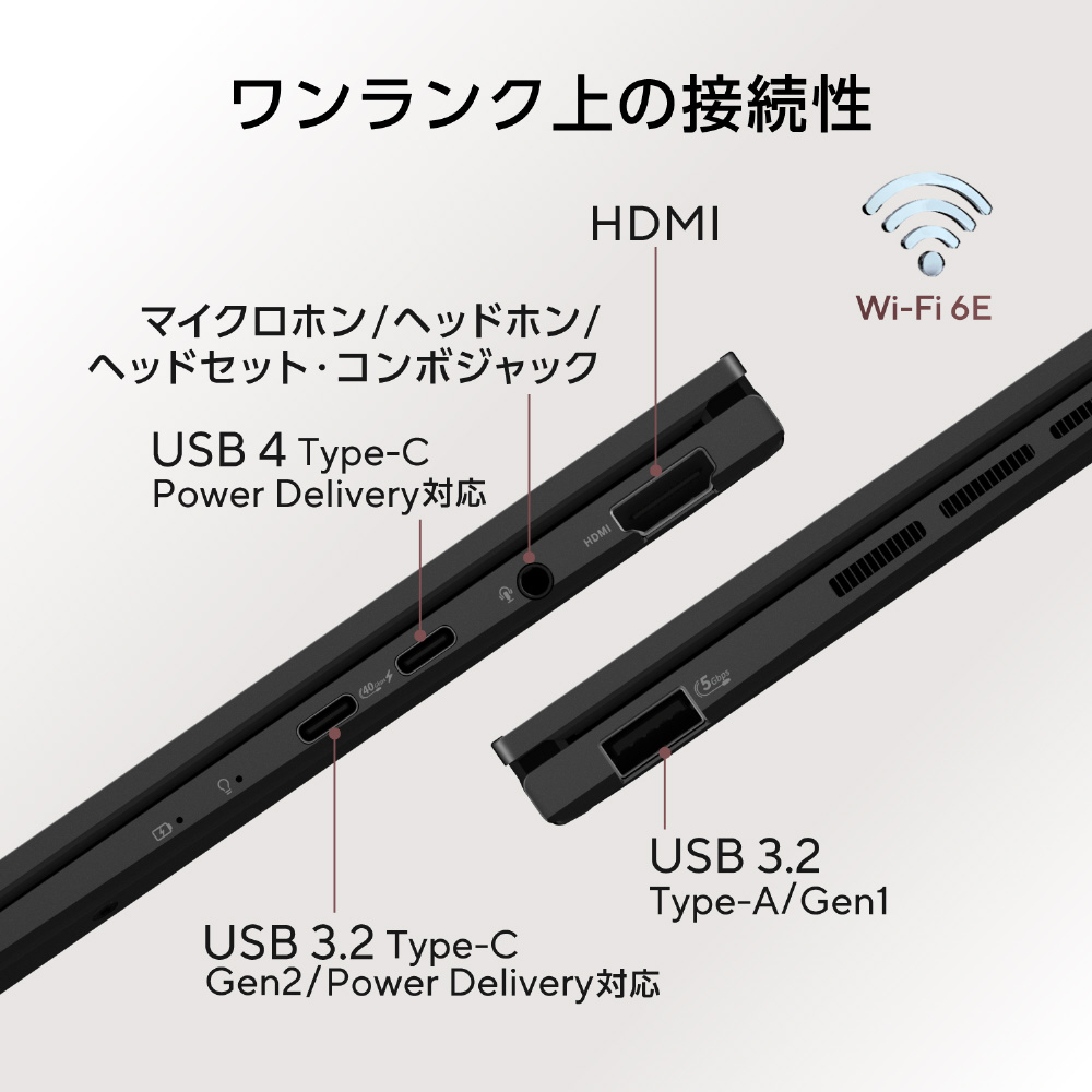 高速充電・データ転送・映像出力対応のUSB4 Type-Cをはじめ、USB 3.2 Gen2 Type-C、HDMI、USB 3.2 Gen1 Type-Aおよびオーディオコンボジャックを備えています。さらに、Wi-Fi 6Eにより、高速でシームレスな接続性を提供します。