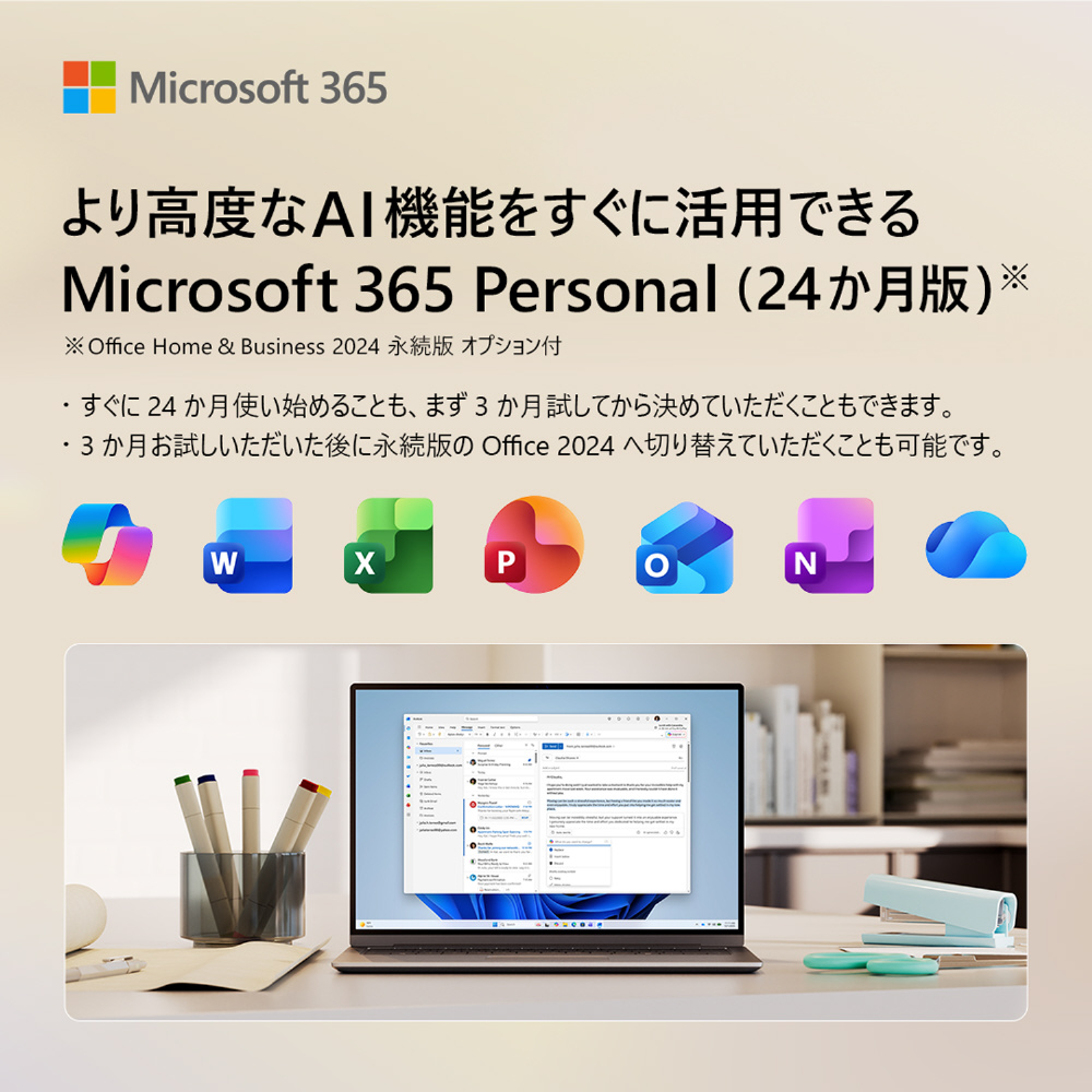 | Officeソフト | Microsoft 365 Personal (24ヶ月版) / Office Home & Business 2024 オプション付 |