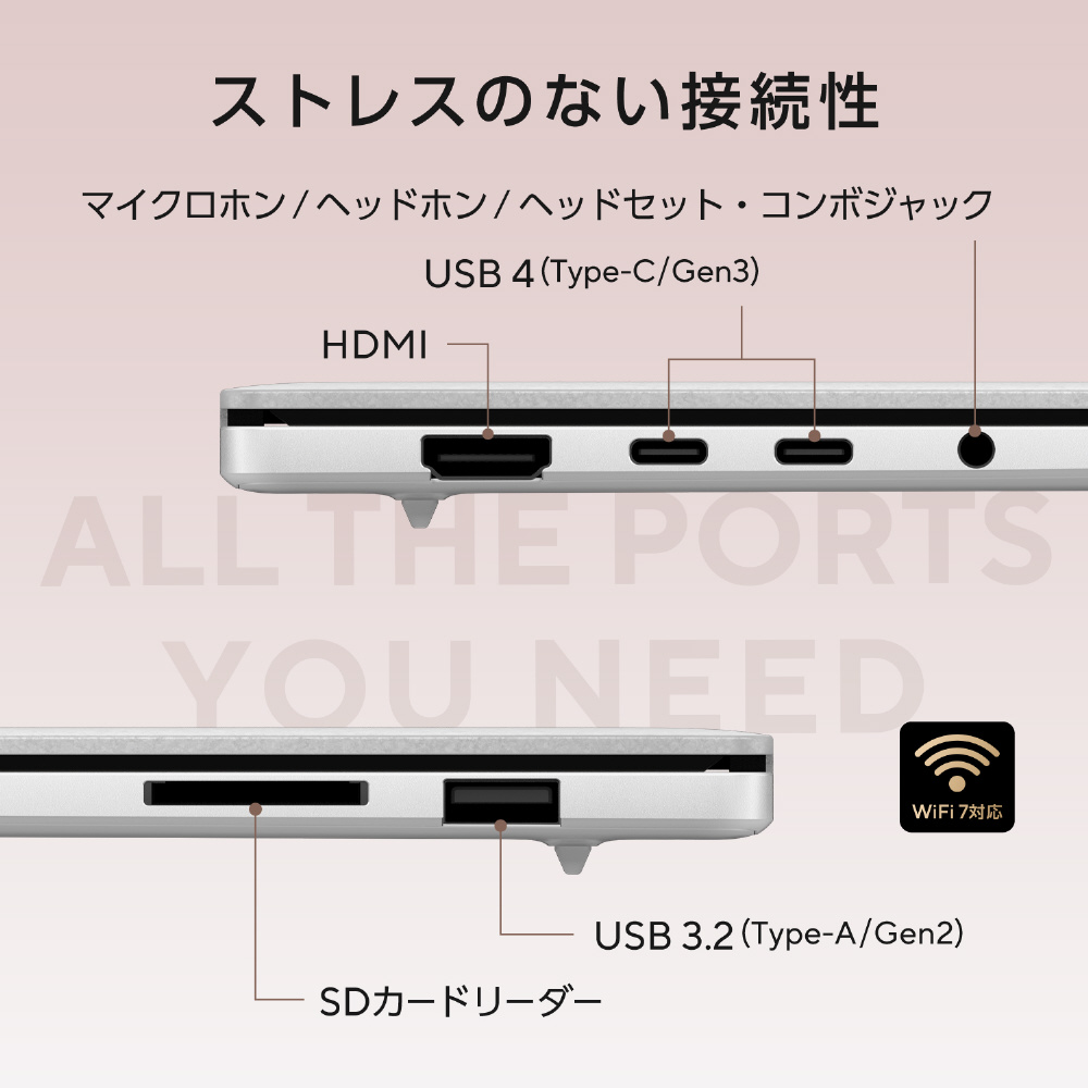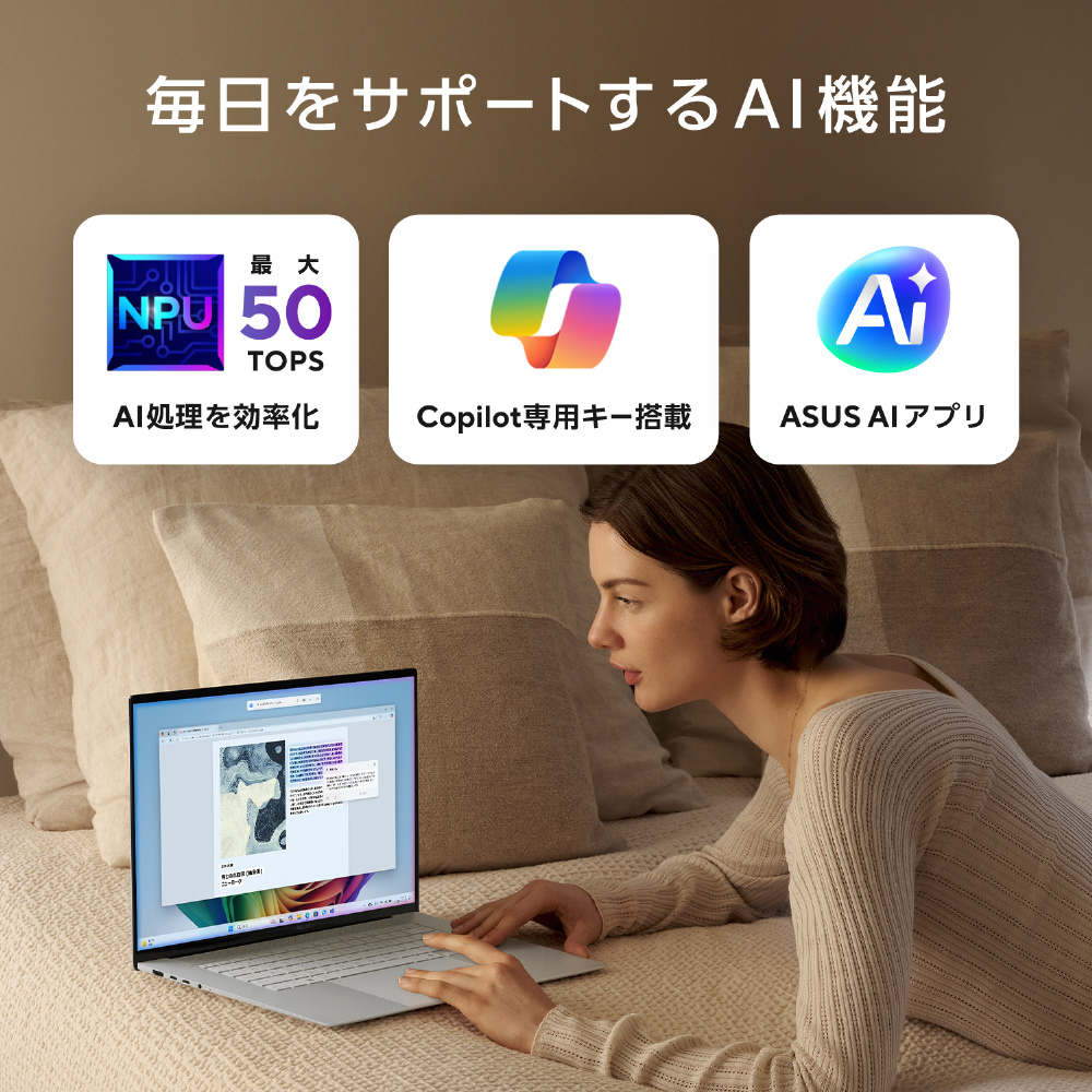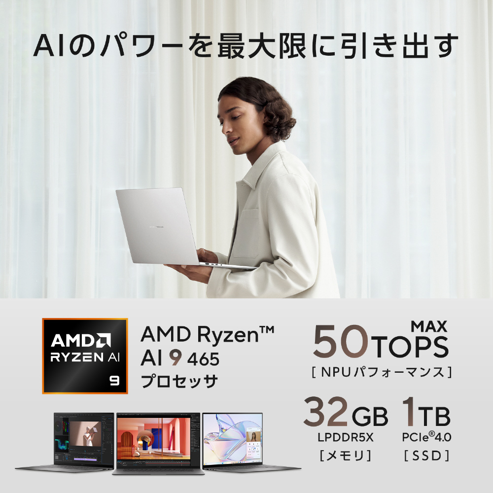新しいAMD Ryzen AI 9 465プロセッサ搭載。高速AI処理を叶えるマックス50TOPS NPU、AMD Radeon 880M グラフィックスを内蔵し、画像認識、音声認識、自然言語処理、生成AIなどのタスクを圧倒的なパワーでこなします。また、高速と大容量の1TB SSDと32GBのメモリを搭載し、優れたAIエクスペリエンスと生産性を同時に叶えます。