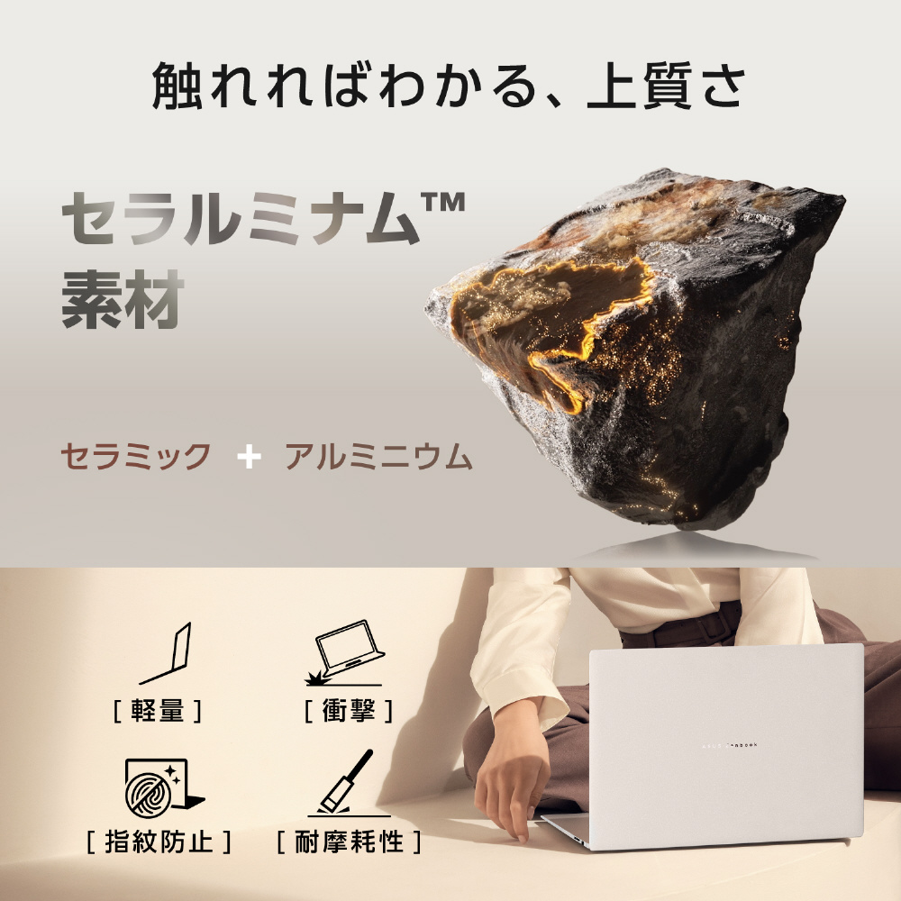 セラミックの美しい質感とアルミニウムの軽さ・堅牢性を兼ね備えた独自のセラルミナム素材を本体に採用。傷や汚れにも強く、インスピレーションを生む現代的なカラーと、CNC加工の精密な職人技が相まって、他にない唯一無二のノートPCとして長い間使用いただけます。