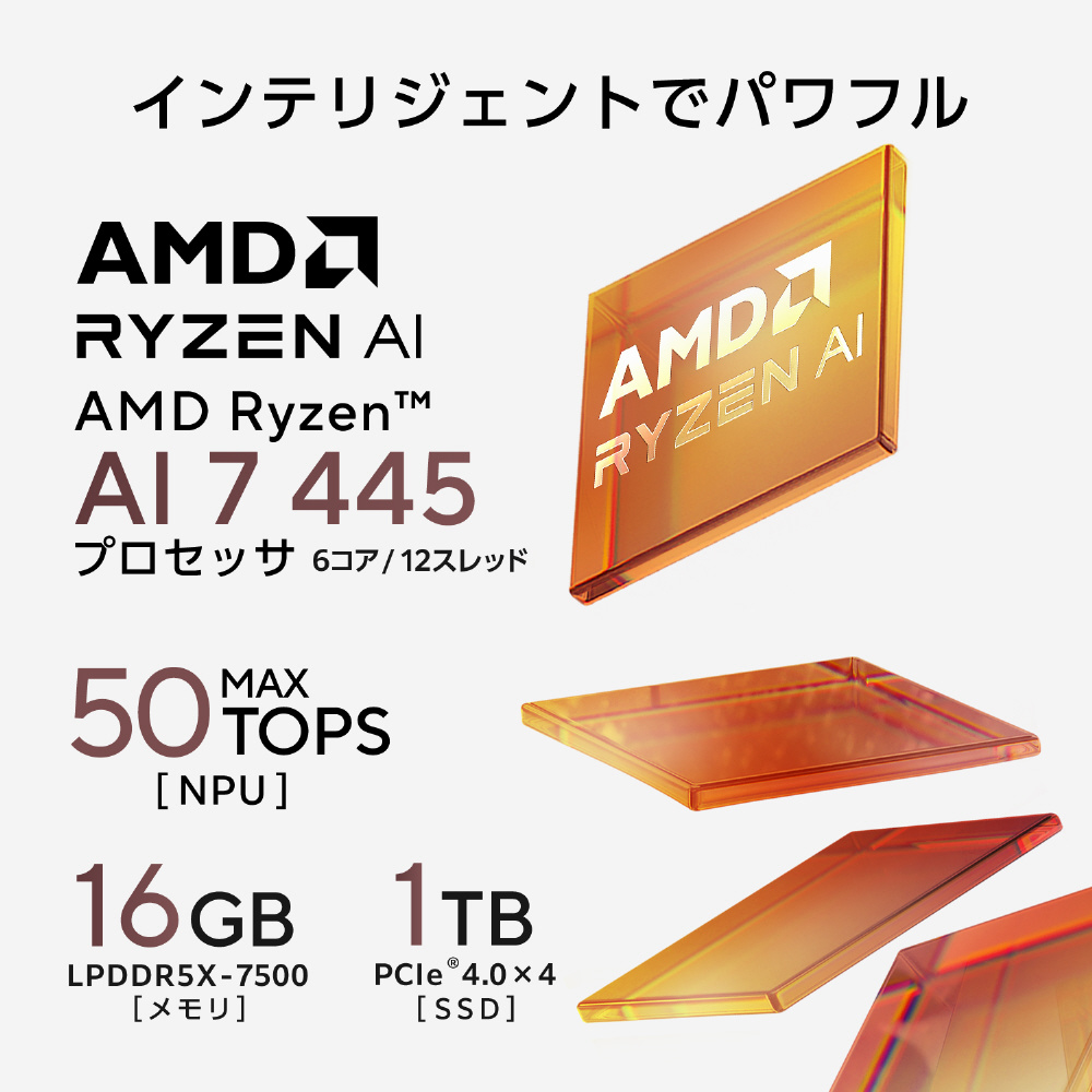 AMD Ryzen AI 7 445プロセッサ搭載。高速AI処理を叶えるMAX50TOPS NPU、AMD Radeon 840Mグラフィックスを内蔵し、画像認識、音声認識、自然言語処理、生成AIなどのタスクを圧倒的なパワーでこなします。また、高速SSDとメモリを搭載し、優れたAIエクスペリエンスと生産性を同時に叶えます。