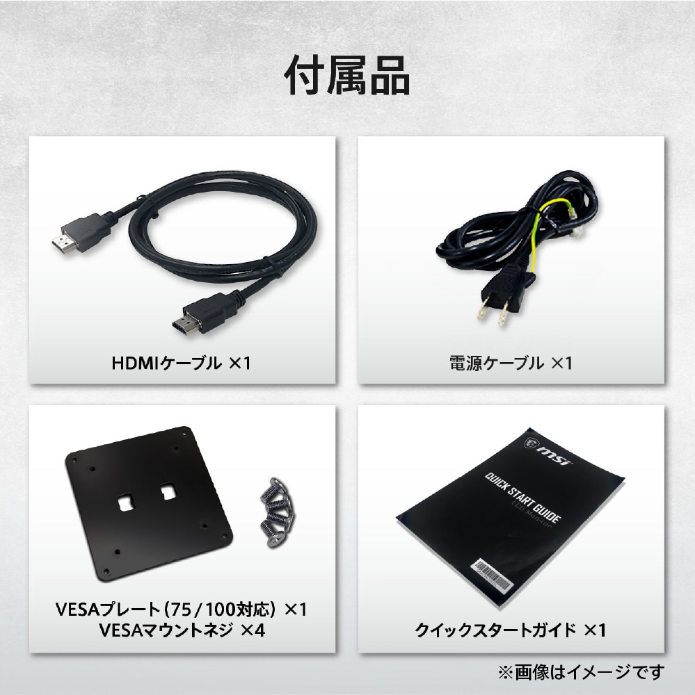 | 付属品 | HDMIケーブル ×1 電源ケーブル ×1 VESAプレート(75 / 100対応) ×1 VESAマウント用ネジ ×4 クイックスタートガイド ×1 |