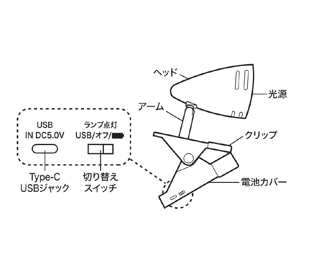 乾電池式クリップライト CLL01DB01WH 白 2WAY電源(乾電池・USB(Type-C))対応 昼光色相当 [LED /昼光色]