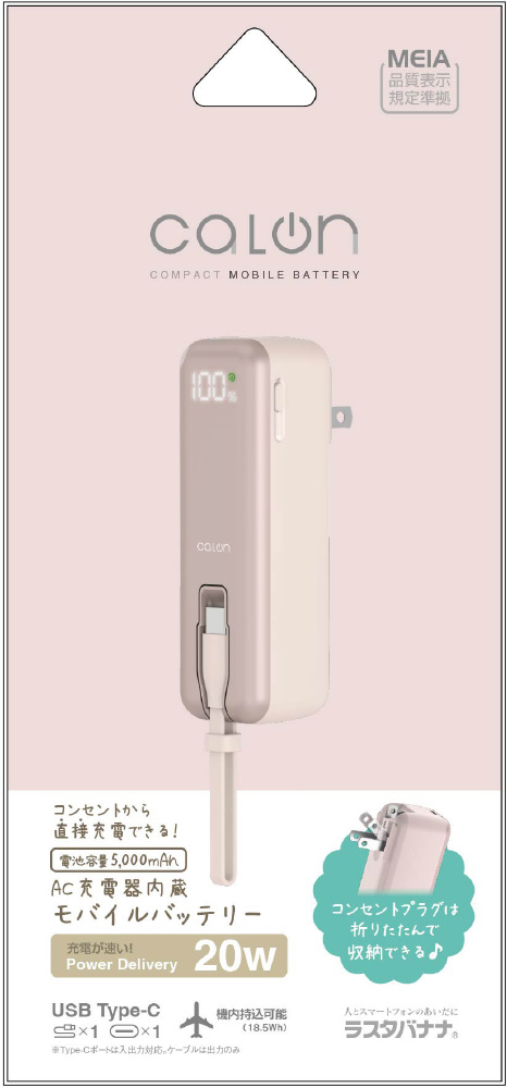 calon 5000mAh ACモバイルバッテリー Cポート×1 Cケーブル×1 PD20W スモーキーピンク RLI050AC20W01SPK [USB Power Delivery対応 /1ポート]