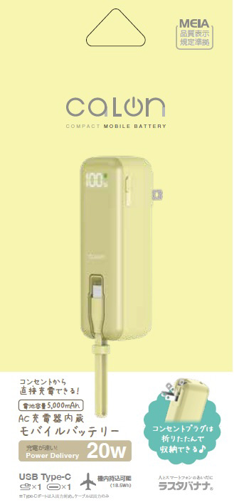 calon 5000mAh ACモバイルバッテリー Cポート×1 Cケーブル×1 PD20W ライトイエロー RLI050AC20W01LY [USB Power Delivery対応 /1ポート]