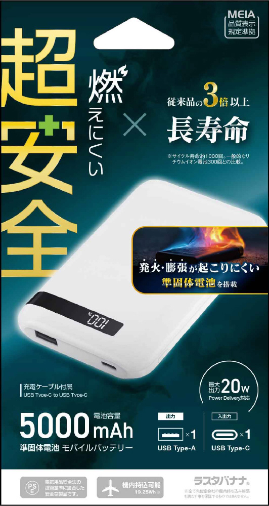 | 商品名 | 5000mAh 準固体モバイルバッテリー A×1 C×1 PD20W出力 ホワイト RLI050C20W03WH [USB Power Delivery対応 /2ポート] |