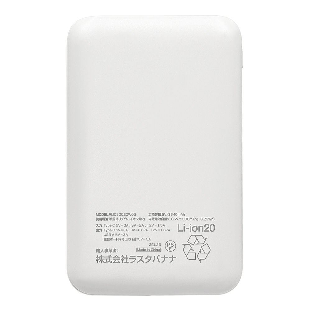 5000mAh 準固体モバイルバッテリー A×1 C×1 PD20W出力 ホワイト RLI050C20W03WH [USB Power Delivery対応 /2ポート]