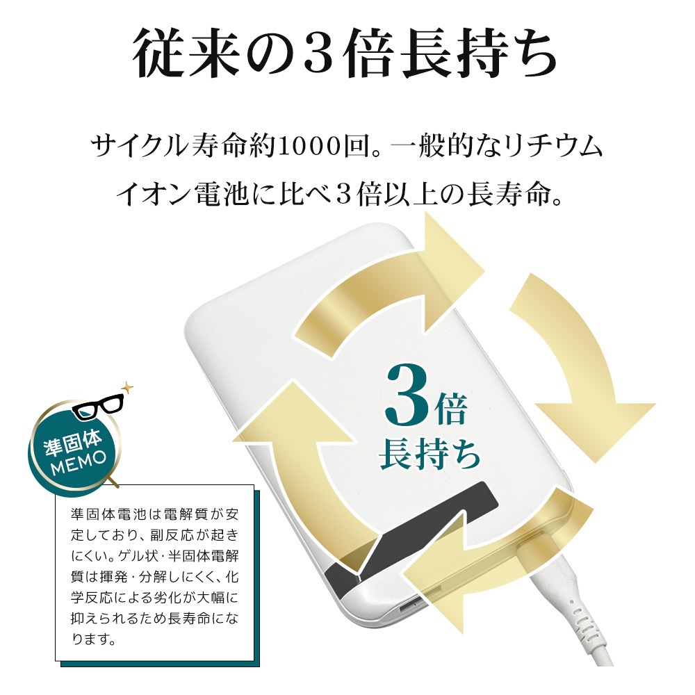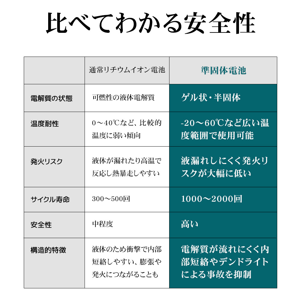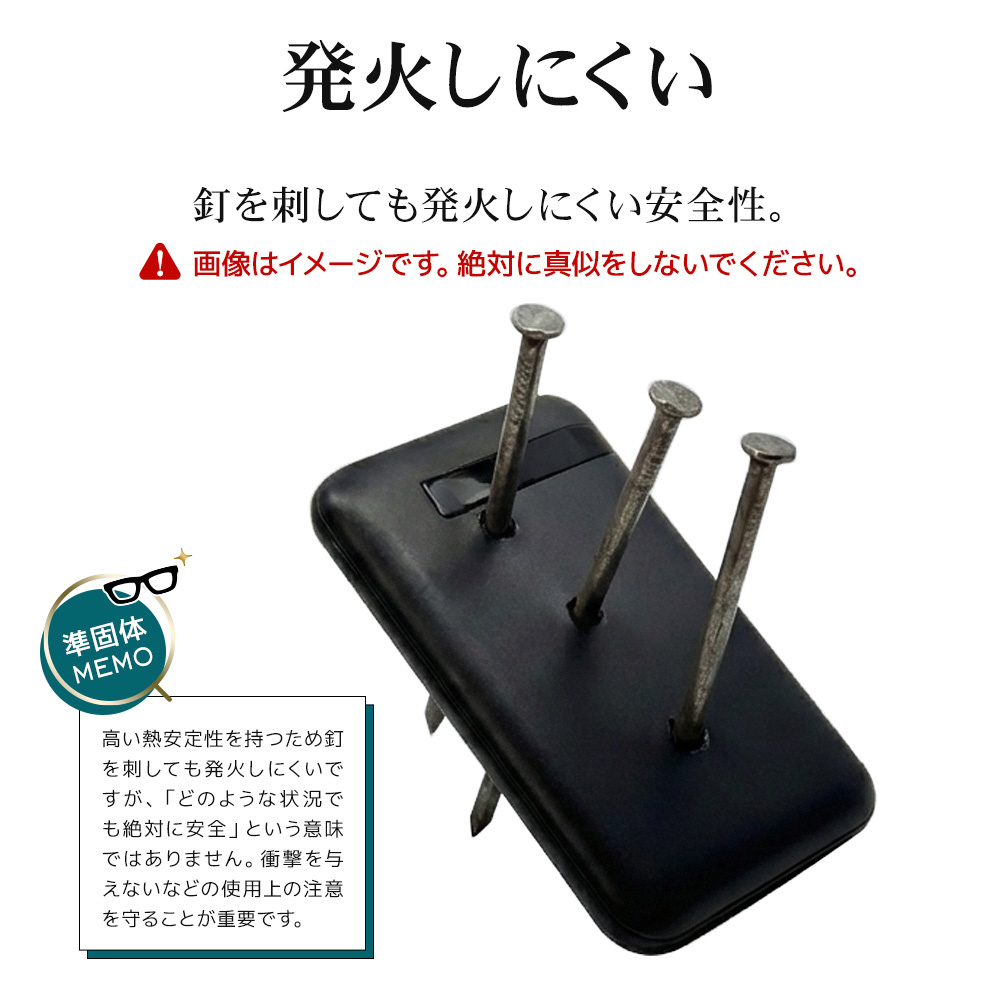 一般的なリチウムイオン電池に比べ発火・膨張が起こりにくい、安全性の高い準固体モバイルバッテリー。