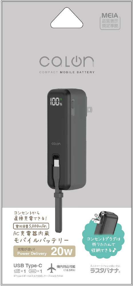 calon 5000mAh ACモバイルバッテリー Cポート×1 Cケーブル×1 PD20W チャコールグレー RLI050AC20W01CGRY [USB Power Delivery対応 /1ポート]