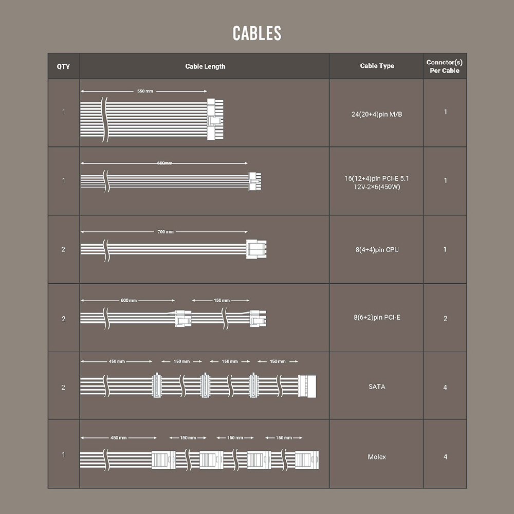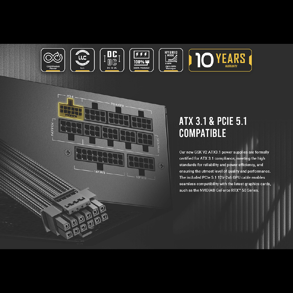 GSK750 V2 ATX3.1 は、80PLUS GOLD 認証を取得した高効率高耐久電源ユニットです。ケーブルマネジメントに優れたフルモジュラーケーブルを採用、奥行き140 mmのコンパクト設計で、小型ケースにも最適な電源ユニットです。ATX3.1、PCIe 5.1に対応しているのでRTX 50シリーズにも対応している長期10年保証を付帯した750W電源。