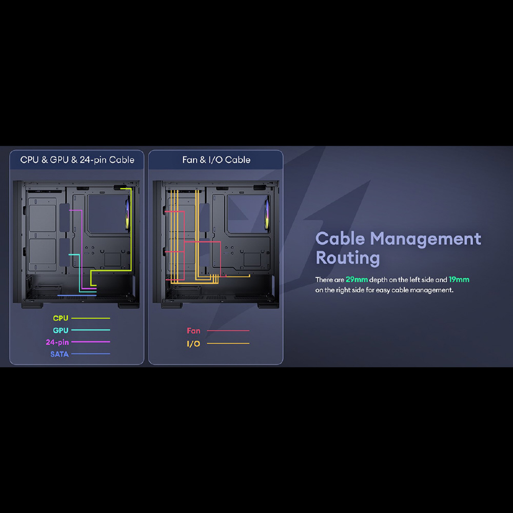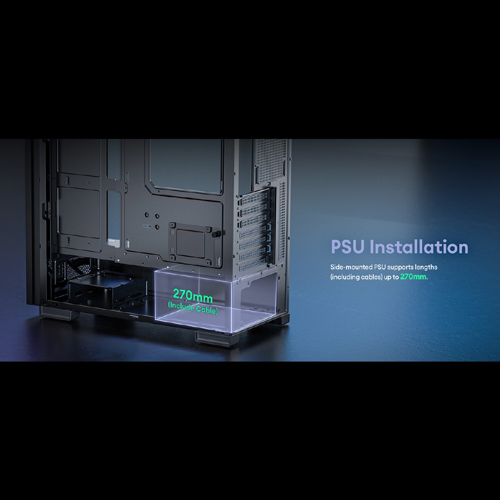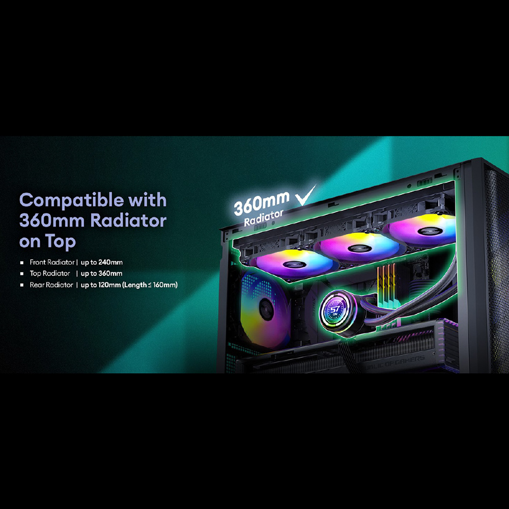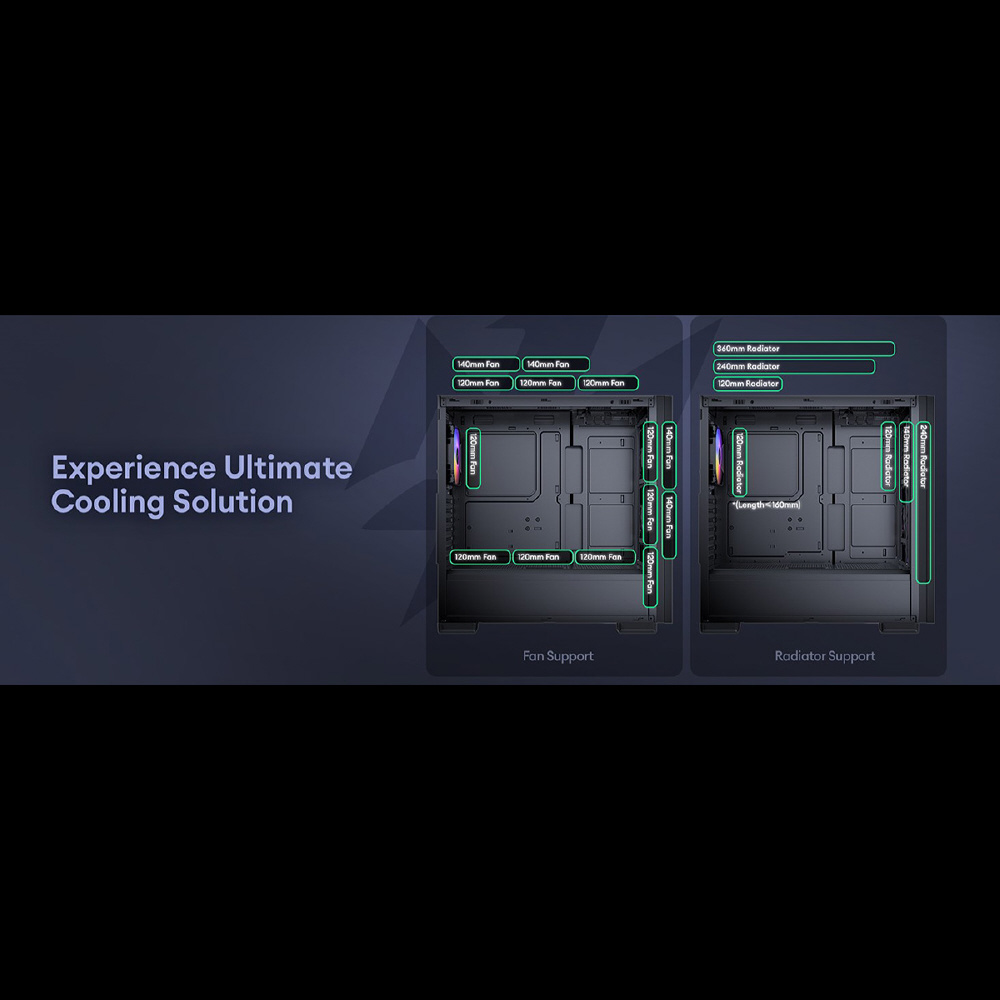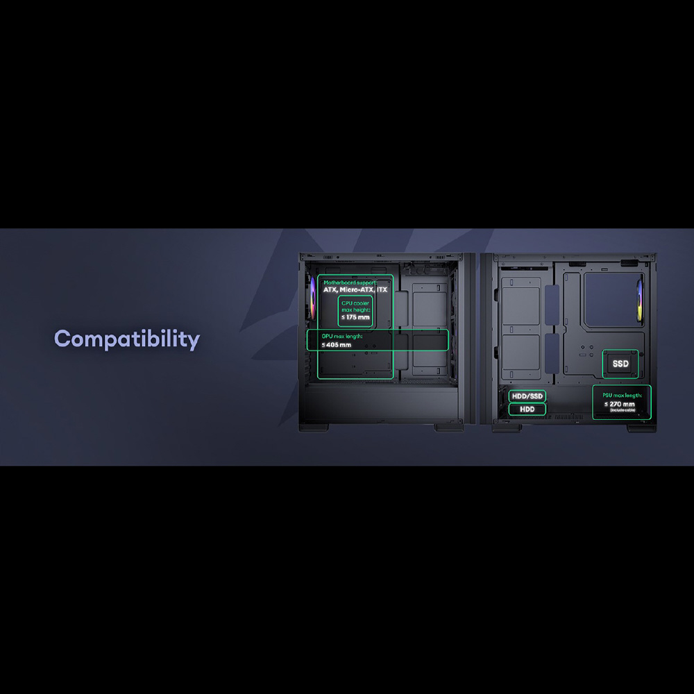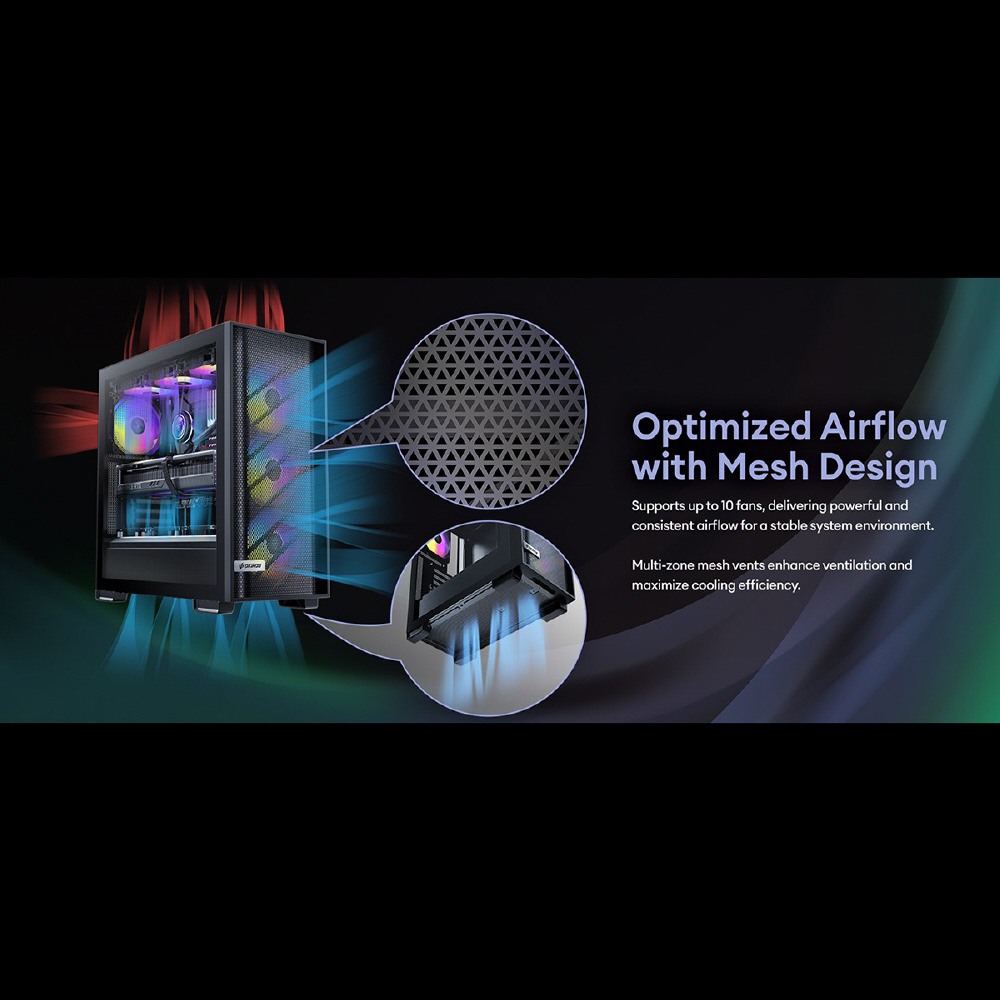 612 C ARGBは、 ARGBファン4個を標準搭載したATX対応のミドルタワーPCケースです。トップとボトムに2つのダストフィルターを備えるほか、最大で405 mmまでの拡張カードスペースを確保、高さ最大175 mmまでのCPUクーラーに対応、3.5/2.5インチ共用シャドウベイと2.5インチ専用シャドウベイを備えています。