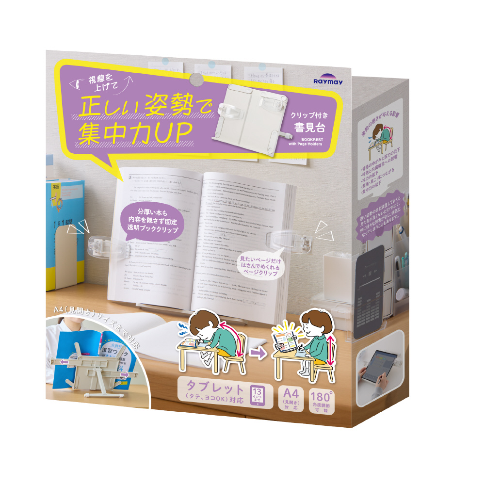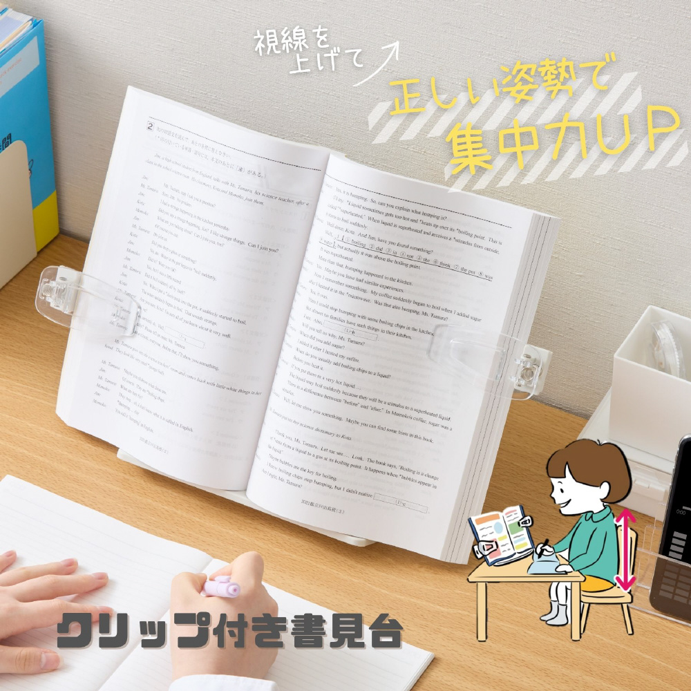 横にスライドする大きなクリップで、分厚い本やタブレットをしっかり固定できる「クリップ付き書見台」。