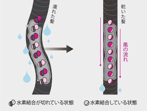 濡れた髪は、髪の内部の水素結合が切れている状態です。この状態から乾かしながら形をまっすぐに固定することで、過度な熱を使わなくてもストレートへ導くことができます。