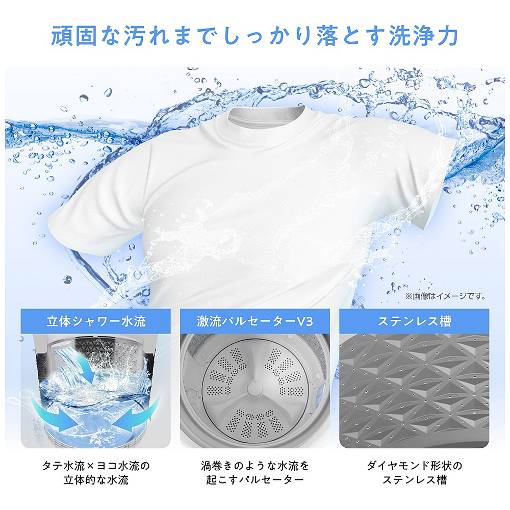 ・「ヨコ水流」に「タテ水流」を加えることで、洗濯物を踊るように動かして頑固な汚れを落とします。