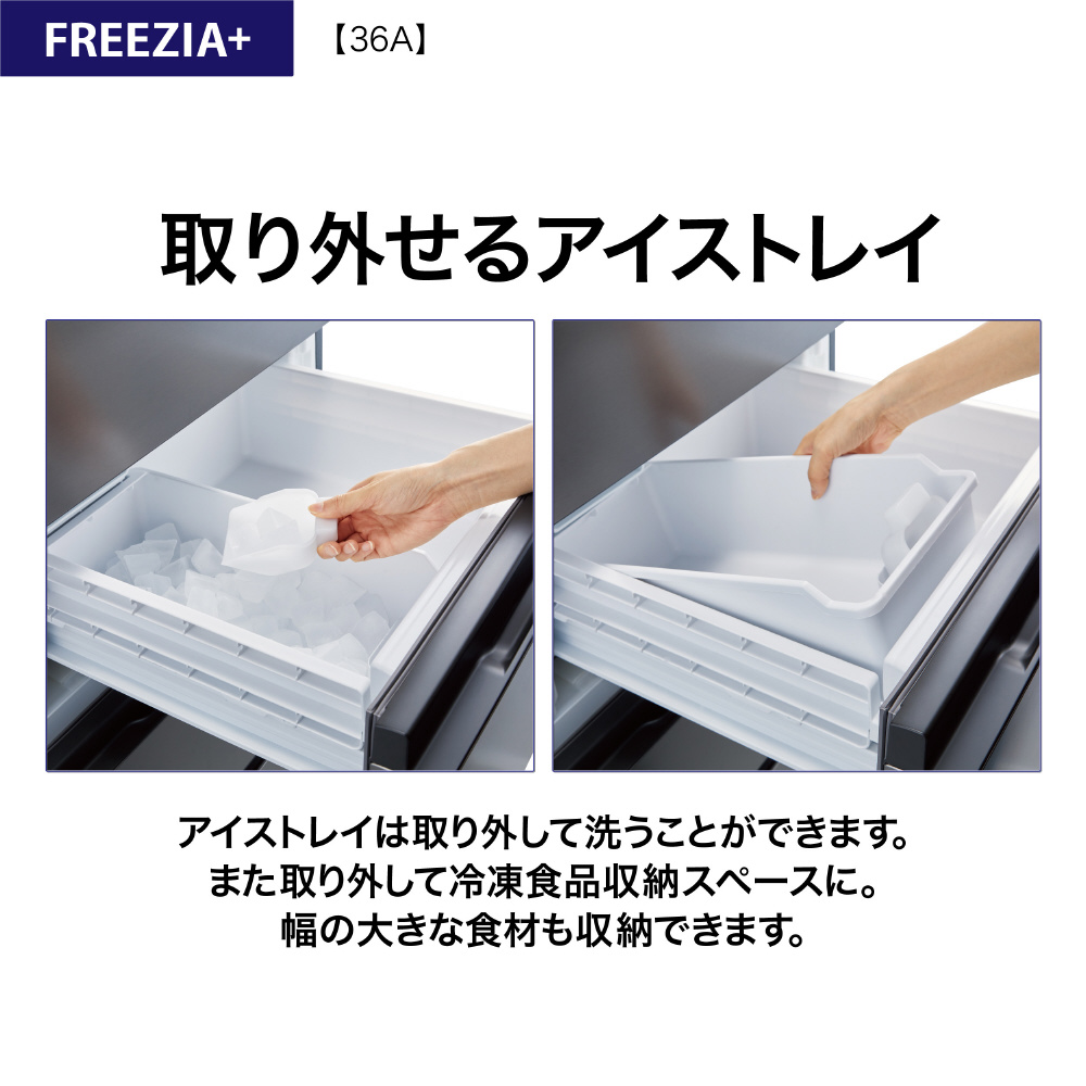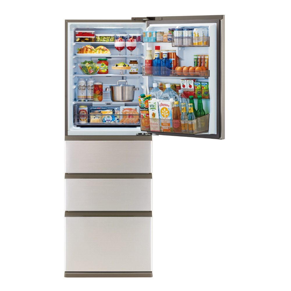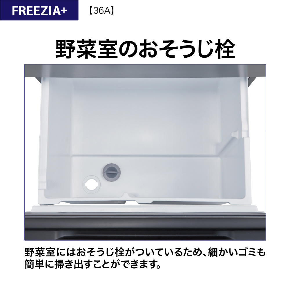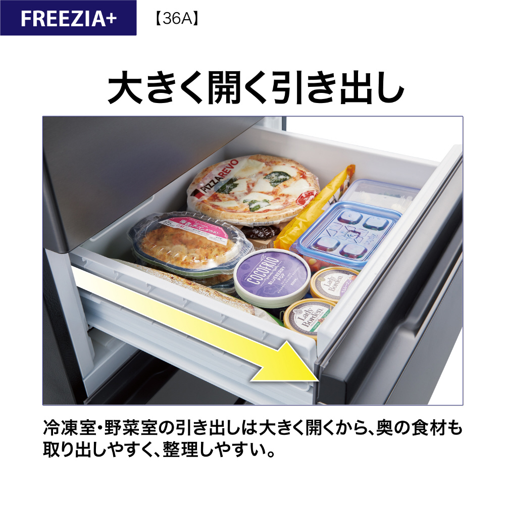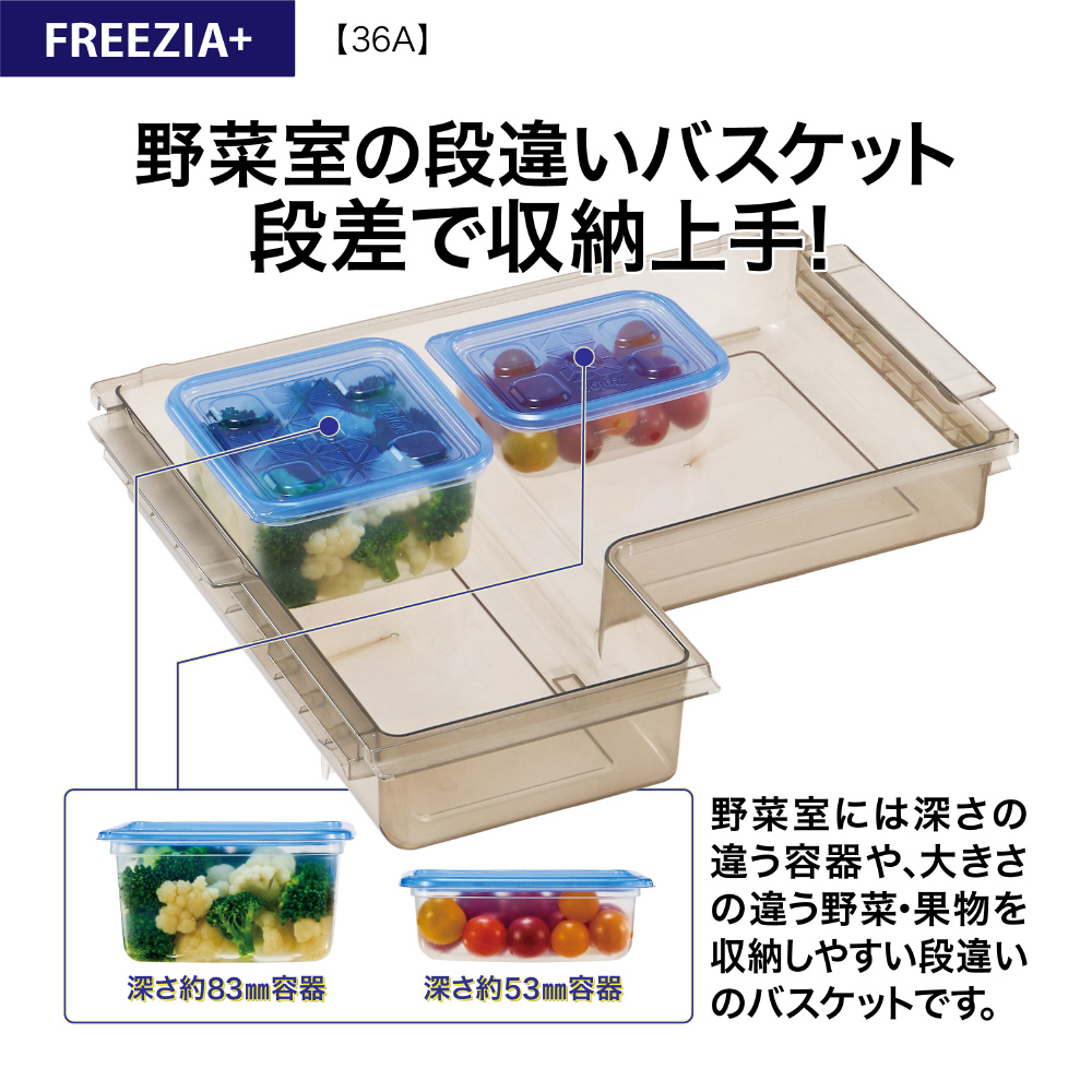 フラット&スクエアのスタイリッシュなデザイン。家計にやさしい省エネ設計や大容量冷凍室、独立野菜室を備えた毎日の食事が楽しくなる冷凍冷蔵庫。