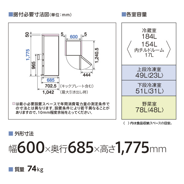 | 仕様1 | 食品収納スペースの目安 ・冷蔵室: <154L> ・内チルドルーム: <17L> ・上段冷凍室: <23L> ・下段冷凍室: <31L> ・野菜室: <48L> |