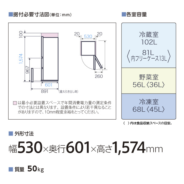 | 仕様1 | 食品収納スペースの目安 ・冷蔵室: <81L> ・内フリーケース: <13L> ・冷凍室: <45L> ・野菜室: <36L> |