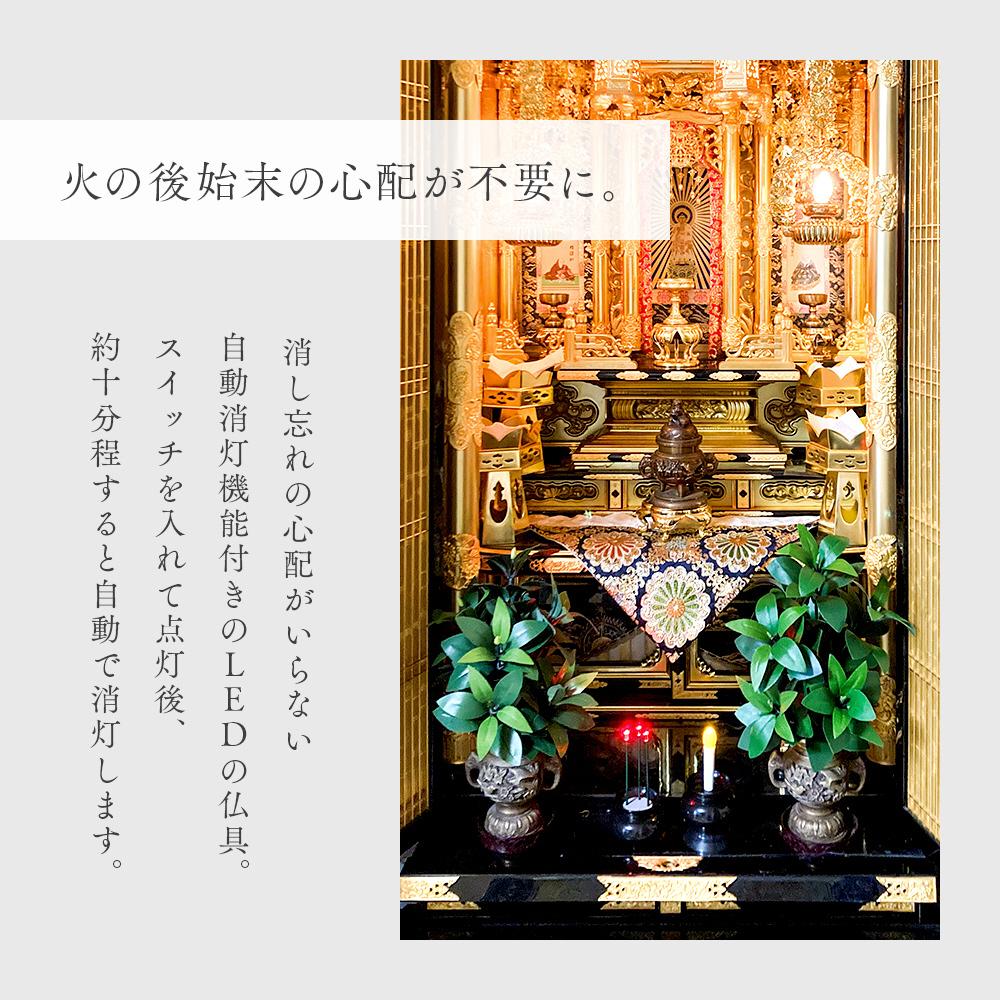 約10分で自動消灯するLED仏具で、消し忘れや火の後始末の心配がなく、一人暮らしや小さなお子様・ペットのいるご家庭でも安心。