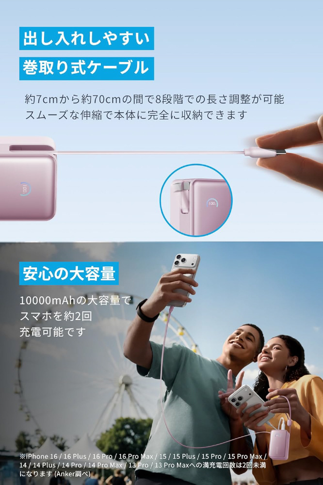 巻取りケーブル一体型の大容量モバイルバッテリー