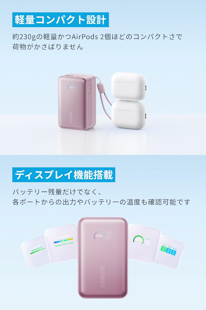 サイズ:約 82×51×36mm、重さ:約230g、容量:10000mAh、入力:USB-C入力:5V=3A / 9V=3A / 12V=2.5A / 15V=2A (Max 30W)、出力:USB-Cケーブル / ポート出力:5V=3A / 9V=3A / 10V=2.25A / 15V=3A / 20V=2.25A (Max 45W)、USB-A出力:5V=3A / 9V=2A / 10V=2.25A / 12V=1.5A (Max 22.5W)、合計Max:24W