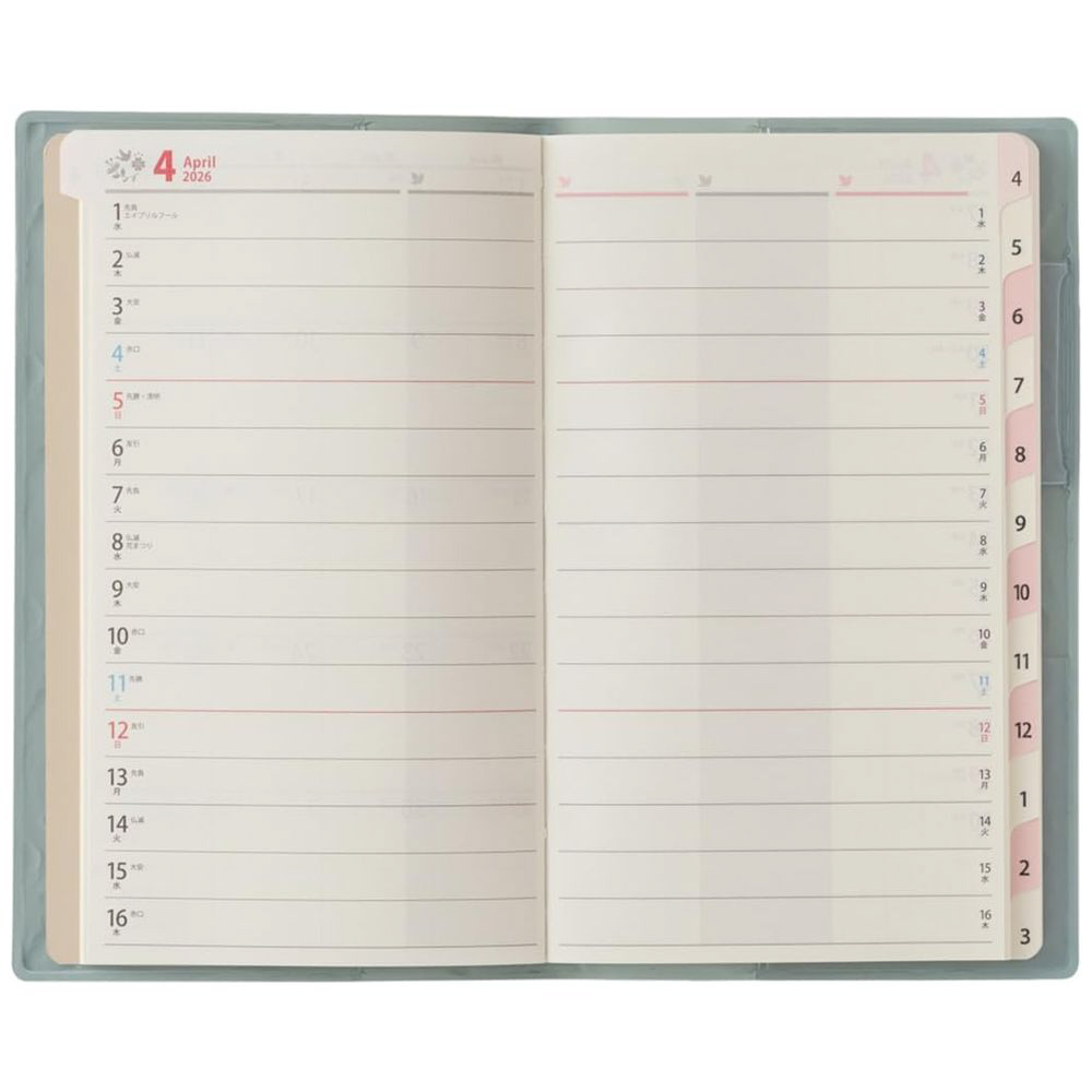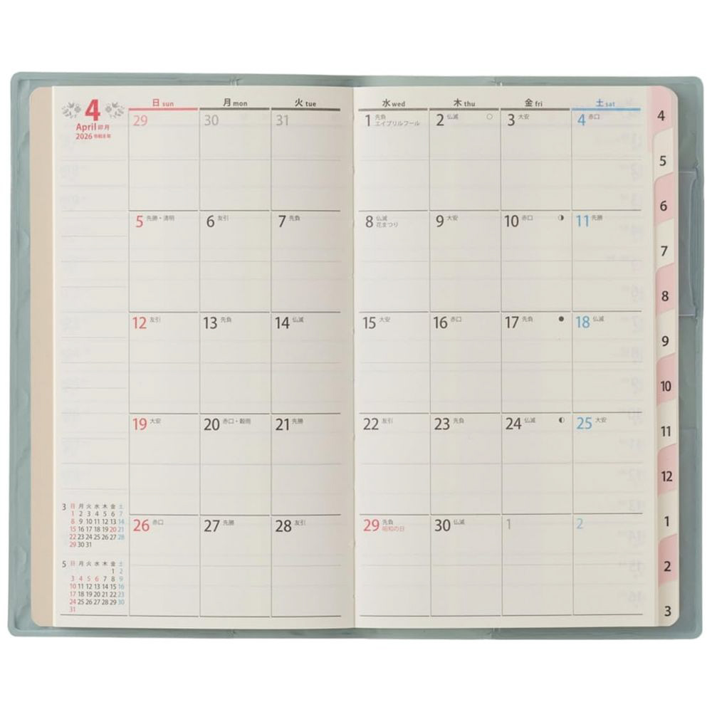 カレンダー感覚で1ヶ月の予定が把握でき、見たいページをパッと開けるインデックス付きです。