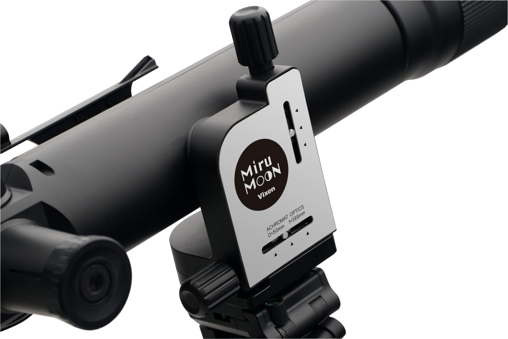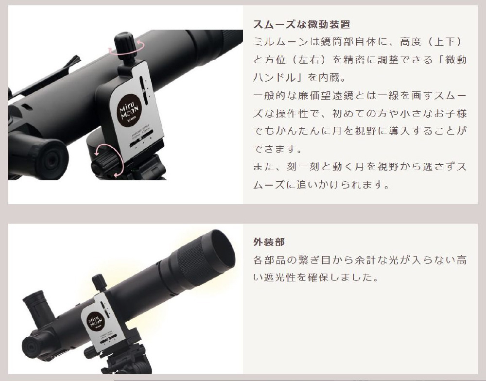 ミルムーンは鏡筒部に、高度(上下)と方位(左右)を精密に調整できる2つの「微動ハンドル」を設けました。