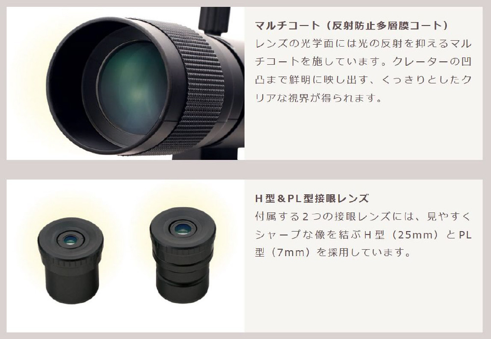 付属する2つの接眼レンズには、見やすくシャープな像を結ぶH型(25mm)とPL型(7mm)を採用しています。