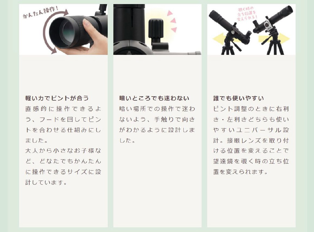 玩具のような手軽さですが、設計・製造は本格的な望遠鏡メーカー。天体観察に親しんでもらうための、確かなこだわりを詰め込みました。