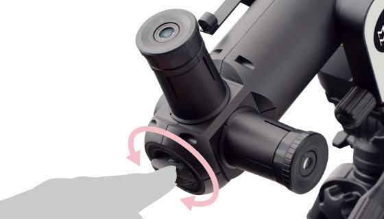 5. ピントを合わせる:低倍率(25mm)の接眼レンズをのぞき、対物レンズ側のローレットを回してピントを合わせます。