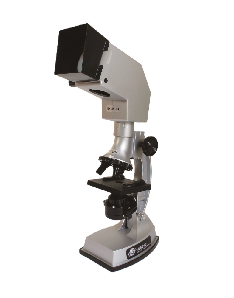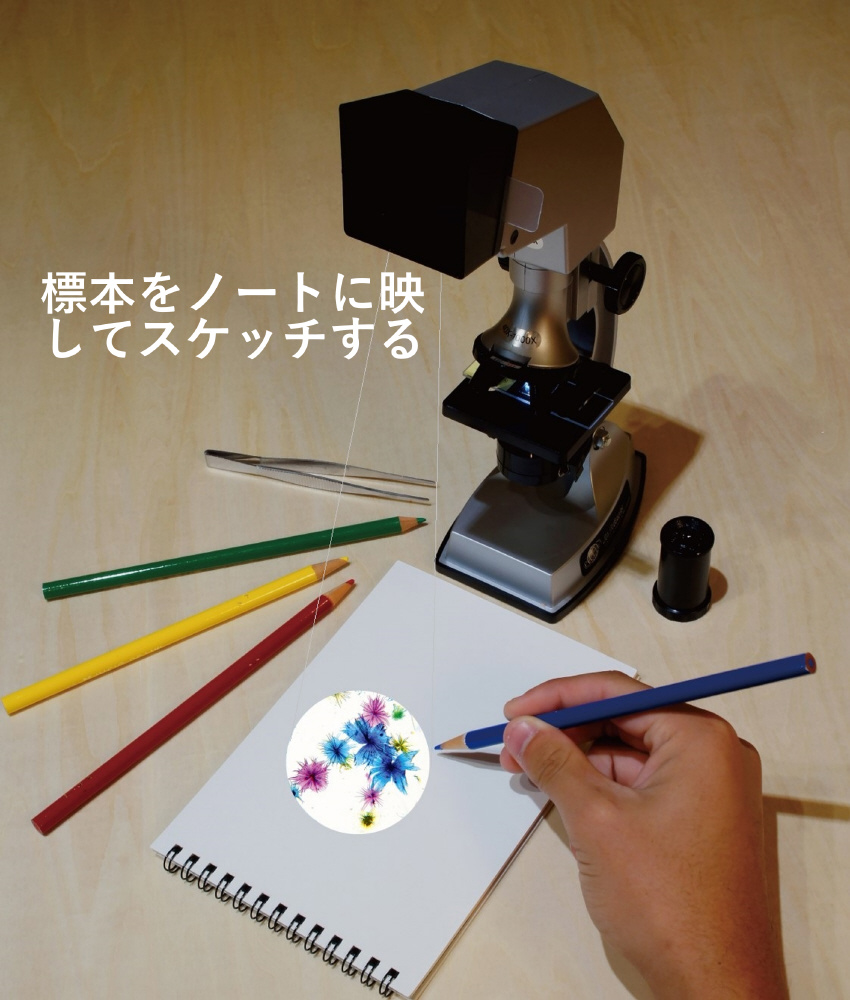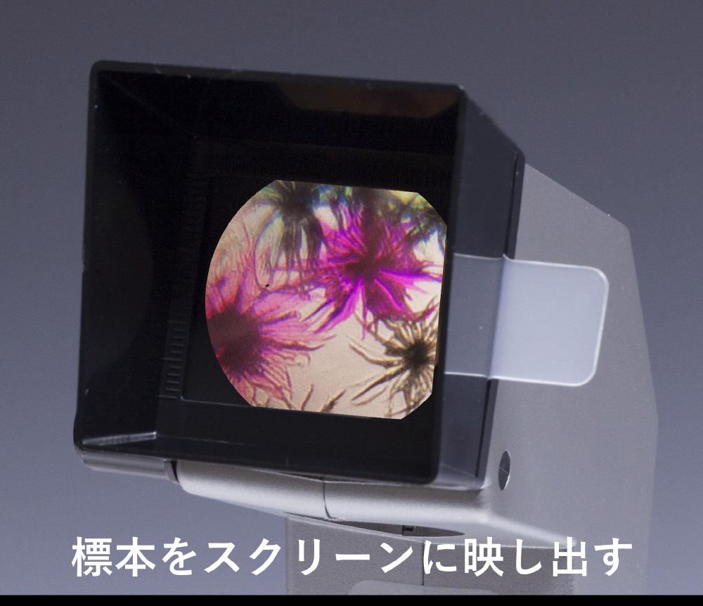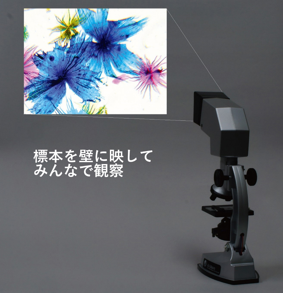 プロジェクター機能が付いた顕微鏡。接眼レンズでのぞく生物顕微鏡としてはもちろん、付属のプロジェクターを使えば、スクリーンやお部屋の壁、ノートの上に標本を映し出して、みんなで観察をすることができます。また、スマホやデジカメで顕微鏡写真も写せます。低倍率から高倍率まで幅広い観察が可能で、顕微鏡を初めてお使いになるお子さまでも楽しんで観察ができます。