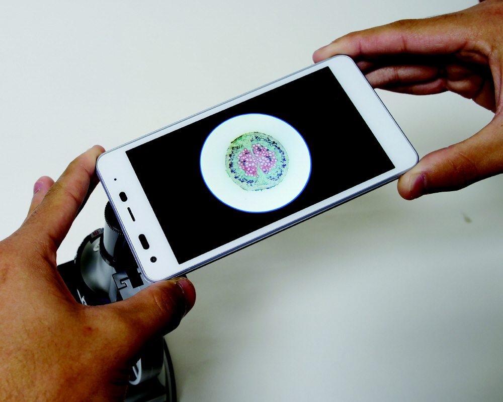 接眼レンズでのぞく生物顕微鏡としてはもちろん、付属のプロジェクター機能を使えば、標本をスクリーンやお部屋の壁、ノートの上などに映し出して、みんなで顕微鏡観察を楽しめます。スマートフォンやデジタルカメラなどで顕微鏡写真を撮影することもできます。
