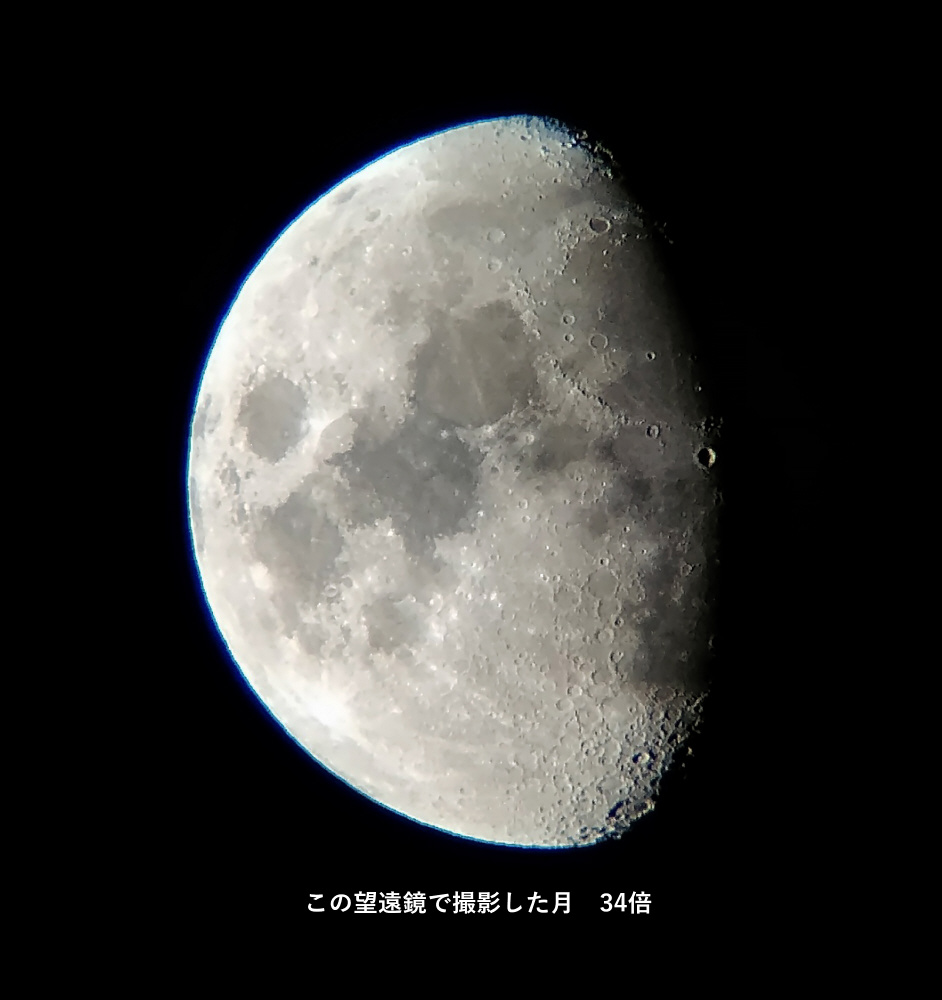 *34倍というと倍率が低いように思いますが、月のクレーターや表面の凹凸、木星の4つのガリレオ衛星、土星の環、代表的な星団や二重星などを観測できます。