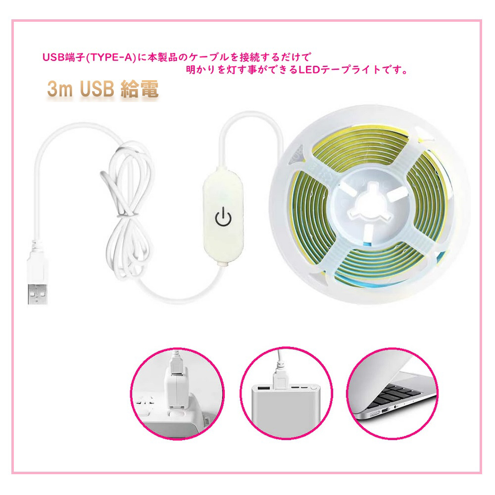 NEW LEDテープライトCOB LED 3m USB給電(グリーン)