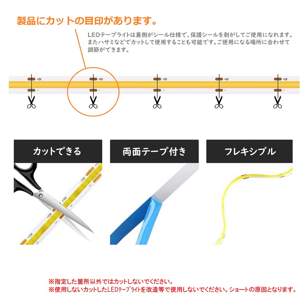 ※使用しないカットしたLEDテープライトを改造等で使用しないでください。ショートの原因となります。