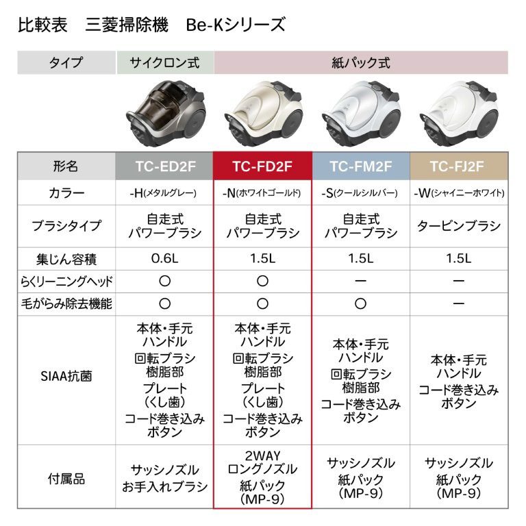 | 商品名 | 三菱紙パック式掃除機 Be-K(ビケイ) ホワイトゴールド TC-FD2F [紙パック式 /コード式] |